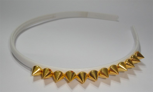 o material é bem simples um tiara que você já tenha em casa contando que seja lisa, aquela cola super bonder e spikes, os que eu estou usando são de plástico e têm a base lisa por isso que dá para colar.